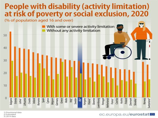 Анализът отчита още, че през 2020 г. приблизително 29% от населението на ЕС на възраст 16 или повече години с увреждане (поради което е налице ограничение в дейността според установената класификация на уврежданията) е било изложено на риск от бедност или социално изключване, в сравнение с 19% от хората, при които не е било налице ограничение в дейността.