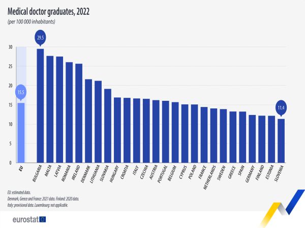 През 2022 г. в ЕС са завършили 69 279 лекари, като в относително изражение на всеки 100 000 жители се падат 15,5 дипломирани лекари. Това представлява лек спад в сравнение със съотношението през 2021 г. от 15,7 завършили лекари на 100 000 жители, отчита статистиката на Европейската статистическа служба.
