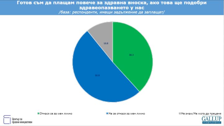 Резултатите са очаквани на фона на общите нива на недоволство, но над една трета намиращи вноската за здраве за висока е индиректен индикатор и за недоверието в модела на финансиране у нас, отбелязват социолозите. Това се потвърждава и от декларираната готовност за плащане повече: ако това ще осигури по-добра здравна услуга, само 38,3% от работещите са готови, като сред тях преобладават основно респонденти с по-високи доходи. Повечето – 50,9%, не засвидетелстват такава готовност. Останалите не могат да отговорят.