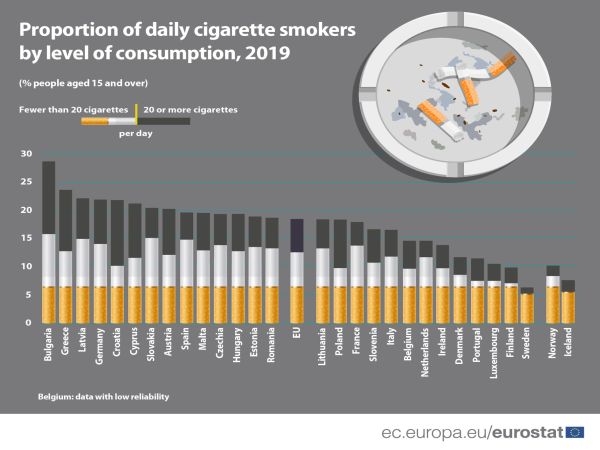 През 2019 г. е имало повече пушачи сред мъжкото, отколкото сред женското население. 22,3% от мъжете на възраст 15 и повече години пушат всеки ден, това се отнася за 14,8% от жените, сочат данните на Евростат.