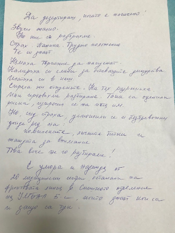 „Да дезертираш, когато е напечено. Но ние ги разбирахме. Страх, паника, трудно положение. Те си знаят. Нямаха търпение да напуснат. Намериха си смени за оставащите дежурства. Платиха си ги в кеш... Но след страха, успокоили се и безтревожни, дойде ред на комплексите, личните битки и жаждата за внимание. Това вече не го разбираме!", се казва в писмото на сестрите от Спешно отделение.