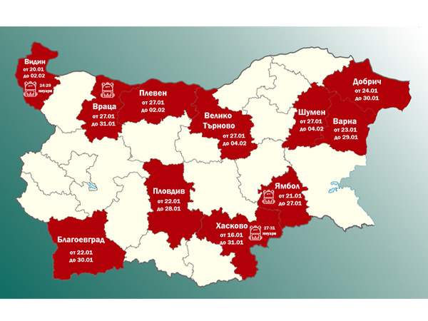 Припомняме, че такива действат още в Добрич, Велико Търново, Варна, Пловдив и Благоевград. Във всички тях със заповед на директорите на съответните регионални здравни инспекции са преустановени профилактичните прегледи, задължителните имунизации и реимунизации и плановите консултации на здрави бременни жени и деца, а също така свижданията в лечебните заведения за болнична помощ и в специализираните институции за предоставяне на социални услуги и социални услуги от резидентен тип за деца и възрастни. В детските ясли и градини се провежда стриктен сутрешен филтър за недопускане на деца и с клинични симптоми на грип и остри респираторни заболявания, както и текущата дезинфекция на повърхности и проветряването на помещенията.