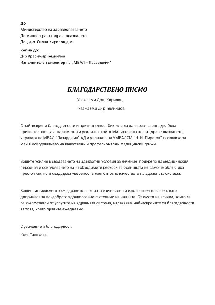Вашият ангажимент към здравето на хората е очевиден и изключително важен, като допринася за по-доброто здравословно състояние на нацията. От името на всички, които са се възползвали от услугите на здравната система, изразявам най-искрените си благодарности за това, което правите ежедневно“, отбелязва в писмото си Катя Славкова.