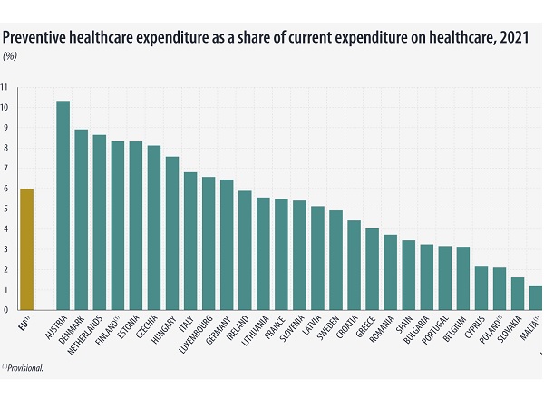 Най-високите дялове на разходите за превантивни грижи са регистрирани в Австрия (10,3% от общите разходи за здравеопазване), Дания (8,9%) и Холандия (8,7%). За разлика от тях, най-нисък дял е регистриран в Малта (1,2%), следвана от Словакия (1,6%) и Полша (2,1%).