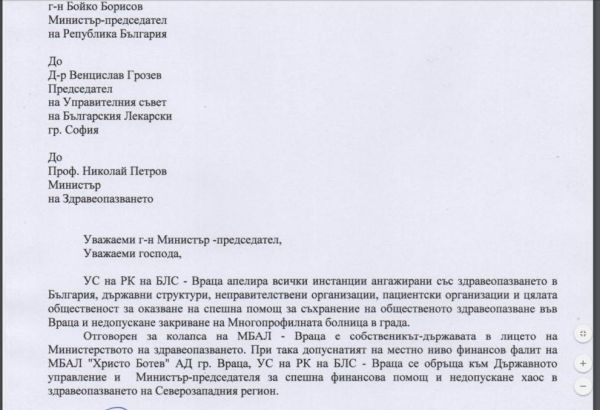 В писмото се заявява още, че отговорен за колапса на МБАЛ-Враца е собственикът на болницата - държавата в лицето на Министерството на здравеопазването. „При така допуснатия на местно ниво фалит на МБАЛ „Христо Ботев“ Враца, УС на РК на БЛС-Враца се обръща към Държавното управление и Министър председателя за спешна финансова помощ и недопускане хаос в здравеопазването на Северозападния регион“, се казва в писмото.