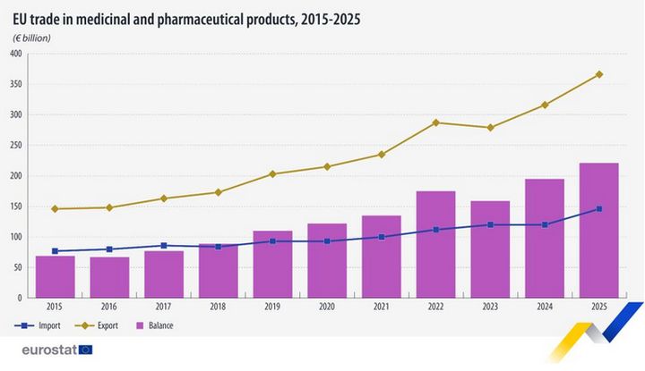 През 2025 г. ЕС е изнесъл лекарствени и фармацевтични продукти на стойност 366,2 милиарда евро и е внесъл такива на стойност 145,7 милиарда евро, което е довело до рекорден търговски излишък от 220,5 милиарда евро. Това показват данните на европейската
