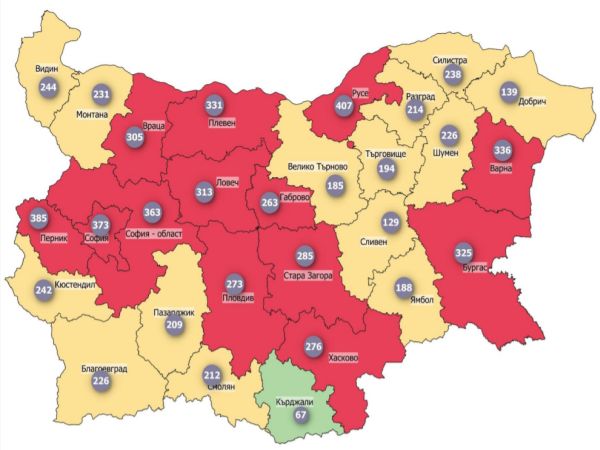Областите в червено пък са 13. Това са Бургас, Варна, Враца, Габрово, Ловеч, Перник, Плевен, Пловдив, Русе, София-град, София-област, Стара Загора и Хасково. Сред тях с най-висока заболеваемост са столицата, Русе и Перник.