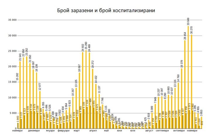 За сравнение за период от 4 седмици при предишната епидемична вълна през месец март – април, при общ брой на заразените от 11-та до 14-та седмица 93 653, в болница са били настанени 27 704, което означава, че тогава са хоспитализирани 29,58% от всички случаи, отчитат още от там.