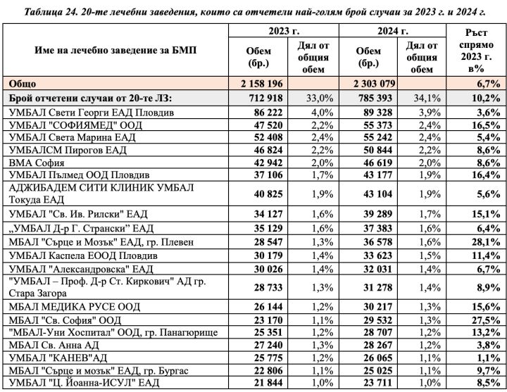 20 лечебни заведения са с най-голям дял на отчетени клинични пътеки - 34,1% от общо отчетените клинични пътеки през 2024 г. От тях с най-голям ръст (над 28,1%) на отчетена дейност спрямо предходната година е МБАЛ "Сърце и Мозък"- Плевен, която има договорени над 10 бр. нови пътеки по вече договорени специалности (съдова хирургия, детски болести, анестезиология и интензивно лечение, нервни болести, неонатология, хирургия, ортопедия и травматология и физиотерапия), спрямо разглеждания период на миналата година. МБАЛ "Света София" е с ръст на отчетената дейност 27,5% спрямо предходната година, поради договорени нови клинични пътеки. УМБАЛ Софиямед отчита ръст с 16,5% спрямо 2023 г., заради договорени нови клинични пътеки за лъчелечение, кардиология, кардиохирургия, инванзивна гастроентерология. УМБАЛ "Пълмед" ООД отчита ръст спрямо предходната година с 16,4%, заради промяна в нивото на компетентност на Отделение по лъчелечение – III ниво и дейност "Урология" – III ниво.